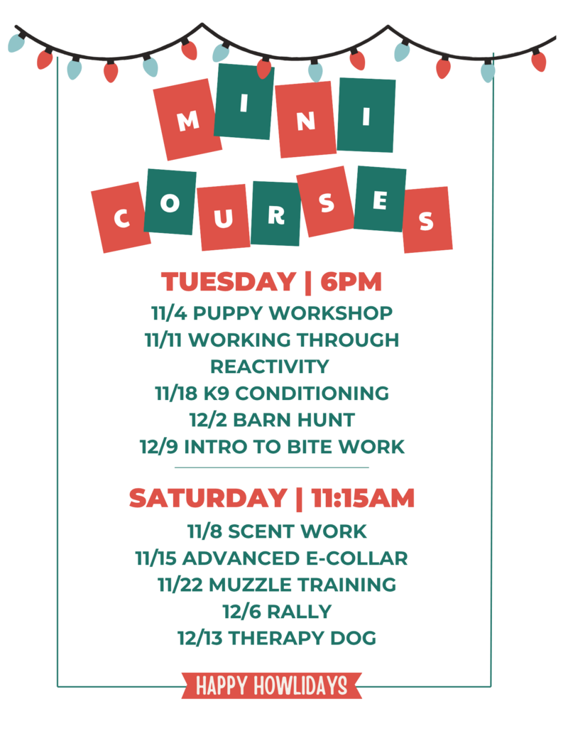 We offer a variety of classes for all ages and kinds of pups and pooches! We regularly have group classes from Puppy classes all the way to Advanced Obedience, including Therapy Dog Certification!